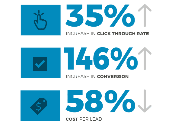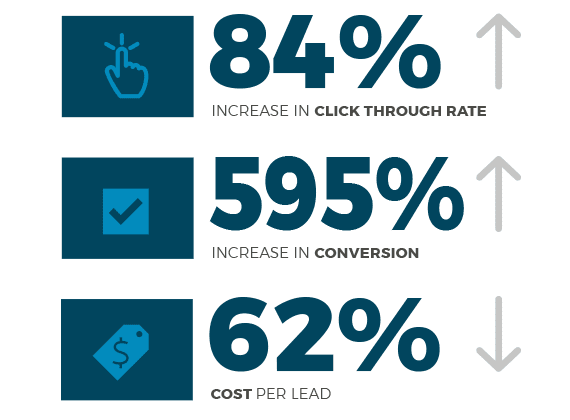 Once we had the engagement data we needed, we were able to improve their ads and settings. Then we saw dramatic improvements. Their click through rate (CTR) increased by 84% and Conversion rate went from 4.38% to 30.45% — an increase of 585%!